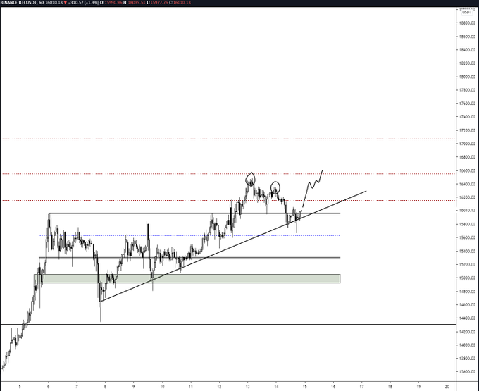 “$BTC – Highs are looking ripe for the taking. A move to $16.6k should take care of that. Further confirmation on a reclaim of $16,150.”